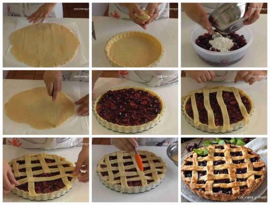 Echamos toda mezcla de las cerezas en la base de la tarta y ahora decoramos con las tiras, formamos una rejilla intercalando las tiras por arriba y por abajo; podéis verlo más claro en el vídeo.