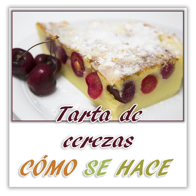 A continuación pondremos sobre la base del molde las cerezas lavadas, y sin tallo. Si tenéis niños podéis deshuesarlas. Para ello un truco; con un palito y en cerezas maduras lo introducimos sobre los extremos y empujamos. El hueso saldrá muy fácilmente. Pero lo ideal para esta receta es hacerlo con las cerezas enteras con el hueso, ya que así es como se hace la receta tradicional de esta tarta. Ahora sólo queda verter la mezcla de la masa sobre las cerezas hasta que cubra todo, y lo taparemos con papel de aluminio durante los 10 primeros min de cocción en el horno para que no se nos queme la tarta. El tiempo total de cocción son de 30 min. a 180º C. Una vez transcurrido el tiempo pinchamos con un palito para ver si esta cocida. Una vez cocida la desmoldamos y espolvoreamos con azúcar glasé.