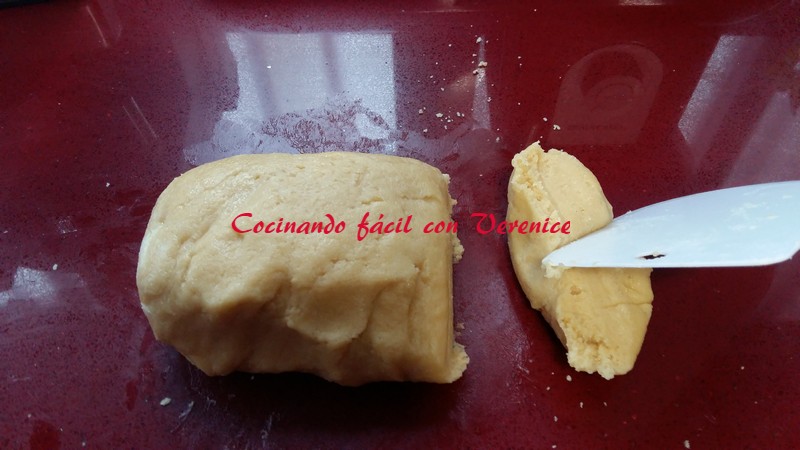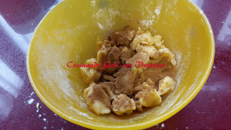 El tercio de masa que dejamos reservado lo enharinamos un poco con maicena y la canela, para hacer con ella una especie de crumble. Con las manos vamos cogiendo pedacitos de la masa y terminando en pequeños trozos, como si fueran galletitas muy pequeñas sin forma alguna.