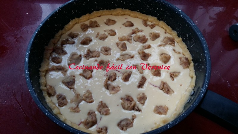 Echamos el relleno de cerezas sobre la masa de la cubeta y con la paleta igualamos por todo alrededor.