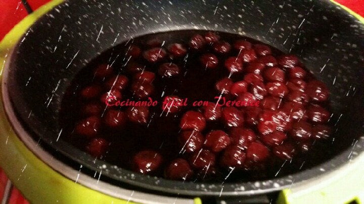 Se echan las cerezas, ya deshuesadas y encima el azúcar y los 100 ml de agua. Dejamos hervir hasta que veamos que suelta un caldito que es una especie de almíbar sin llegar a serlo.
