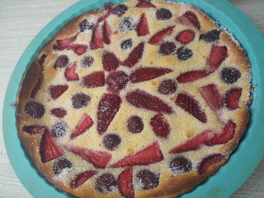 NOTA: En este caso hice dos tartas con la masa. Una sólo de cerezas, y la otra la hice mezclando fresas y cerezas.