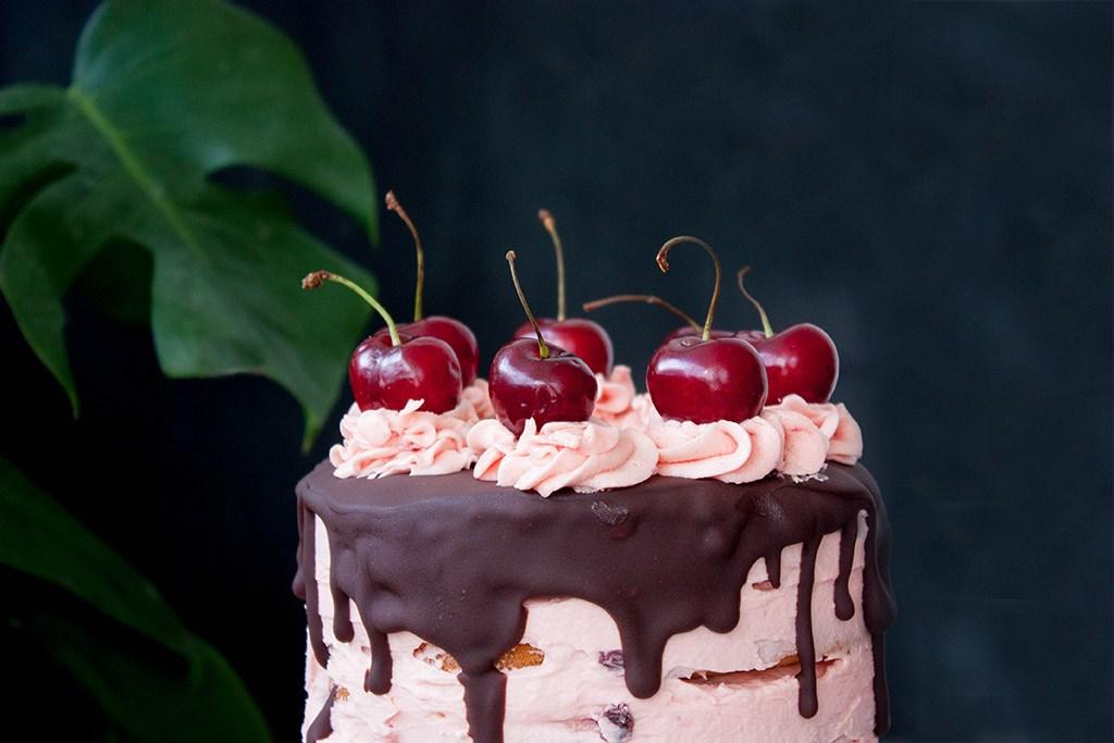 Para esta tarta de cerezas y chocolate primero haremos una masa de bizcocho esponjoso como para hacer la Victoria Sponge Cake y luego la decoraremos con una buttercream que lleva jugo de cerezas. Cuando tengamos montada la layer cake de cerezas añadiremos una ganache de chocolate por encima y dejaremos que chorree un poco por los bordes para darle un efecto más tentador.