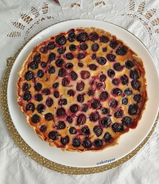 INGREDIENTES: Una placa de masa quebrada, 30 cerezas o más, deshuesadas, aproximadamente, 3 huevos grandes, 80 gr. de mantequilla, 100 gr. de azúcar, 20 gr. de maicena, 1 yogurt griego, 300 gr. de queso crema, la ralladura de medio limón