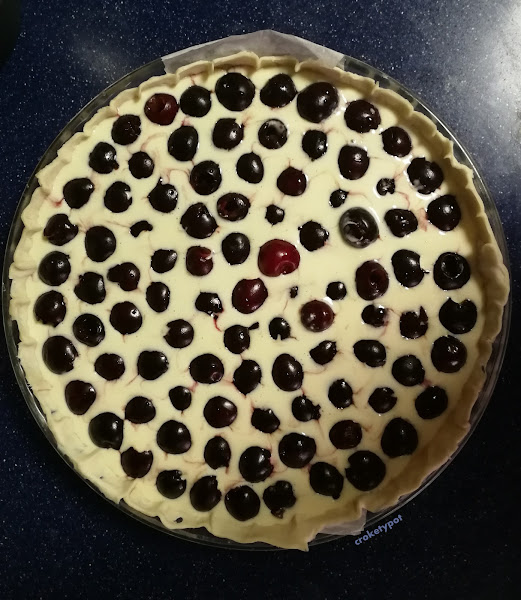 ELABORACIÓN: Si no tenemos las cerezas deshuesadas, las deshuesamos con un poco de paciencia, o las partimos por la mitad y le quitamos el hueso. Engrasamos con mantequilla un molde redondeo de unos 24 cm. ponemos la placa de masa quebrada en el molde, y procuramos que el borde del molde quede cubierto, y adornamos con unos pellizcos alrededor para dar forma. Precalentamos el horno a 180º.