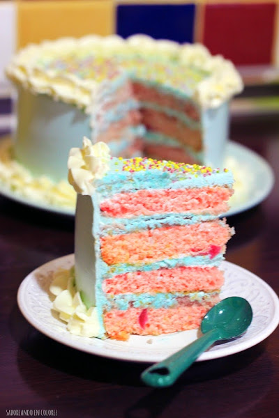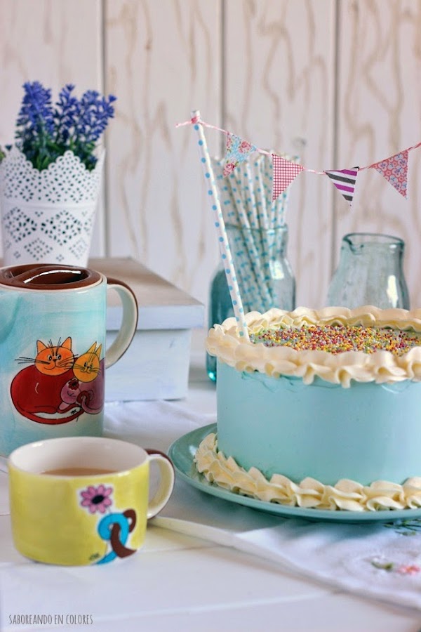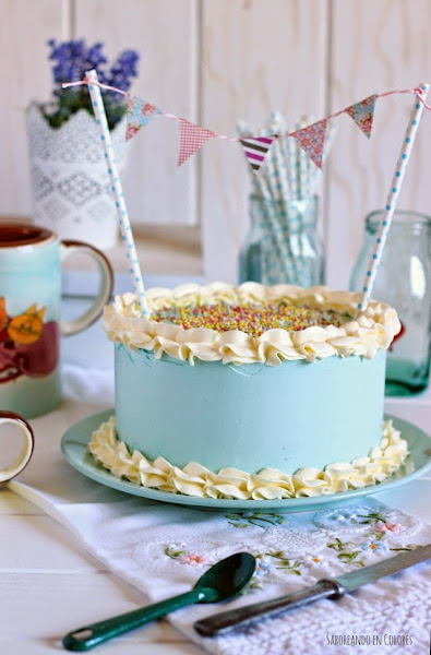 Finalmente con una espátula plana cubrimos toda la tarta, alisamos y unos sprinkles de colores, más decoración de manga con boquilla 1M de Wilton para los bordes, y tenemos una fácil y bonita tarta.