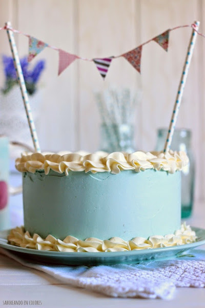 Con los ingredientes indicados preparé una Swiss Meringue Buttercream de acuerdo a la receta que os comparto en este post. Para darle sabor, le agregué dos cucharaditas de extracto de vainilla al final del batido junto con unas gotas de colorante en gel turquesa. Para obtener el color deseado, os sugiero ir probando con el color poco a poco, hasta obtener el tono deseado.