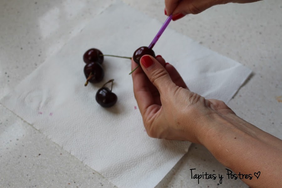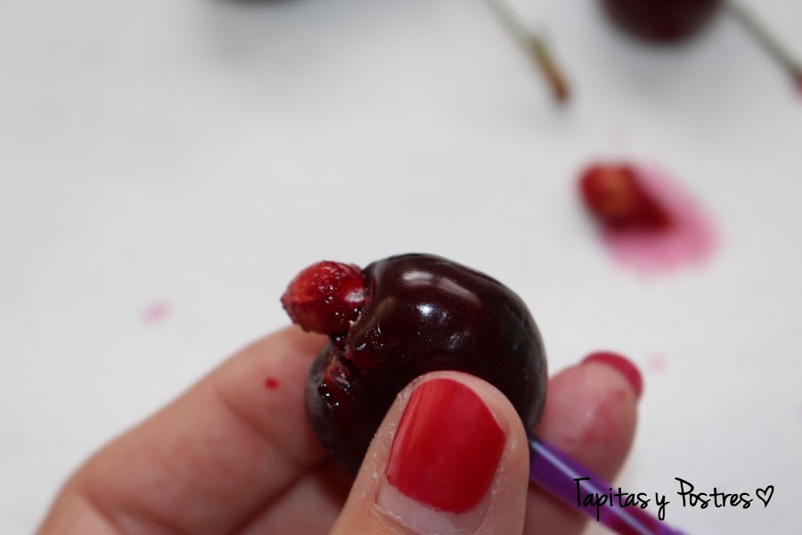 Deshuesamos las cerezas. Introducimos una pajita por el culete de la cereza .