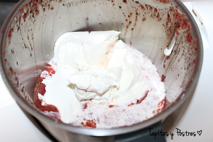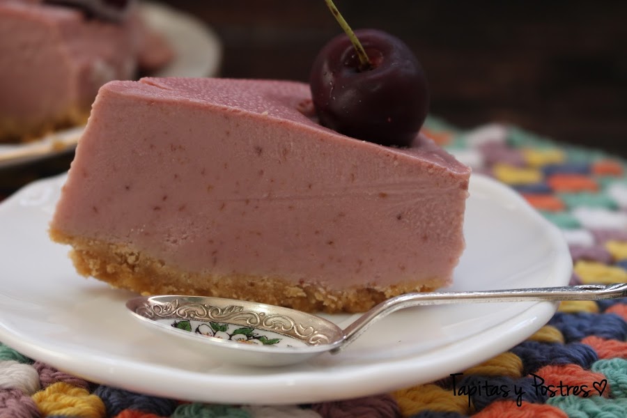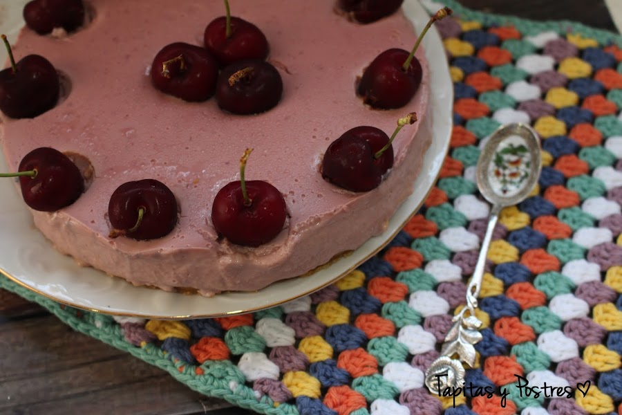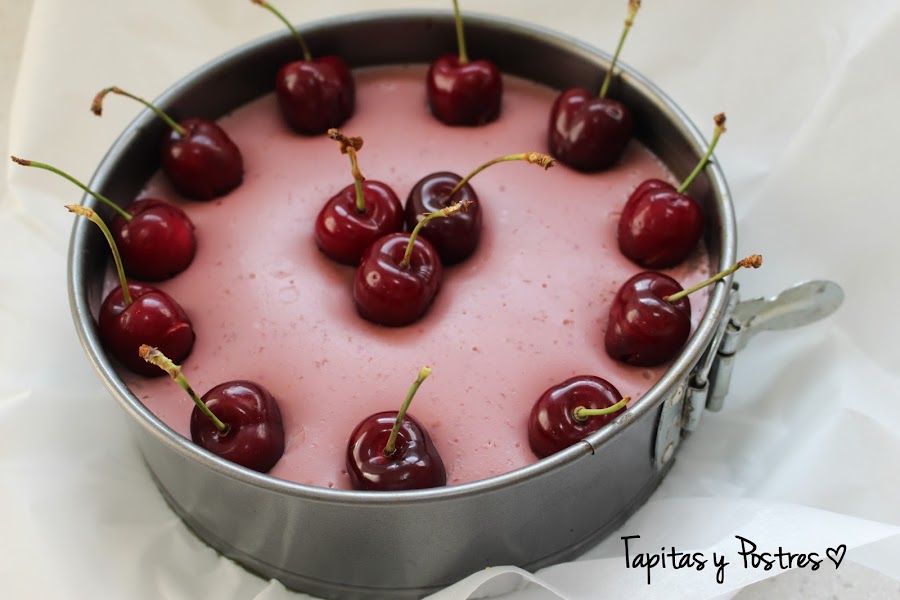 Una vez deshuesadas las cerezas, las trituramos en la thermomix 15 segundos a velocidad 6. Añadimos el resto de los ingredientes (queso, nata (crema de leche), azúcar y cuajada), mezclamos 15 segundos a velocidad 4 y a continuación calentamos la mezcla durante 7 minutos a 90º y velocidad 4. Vertemos la mezcla sobre la base de galletas y dejamos enfriar. Podemos adornar con cerezas poniéndolas sobre la tarta cuando veamos que la mezcla está semi cuajada.