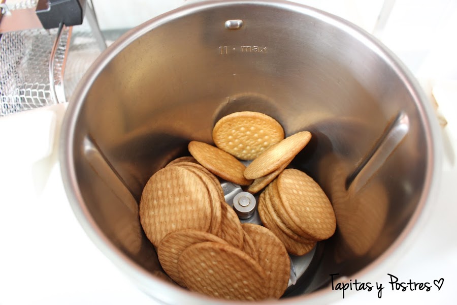 Primero hacemos la base de la tarta triturando las galletas 10 segundos a velocidad 7. Le añadimos la mantequilla a temperatura ambiente y mezclamos 10 segundos a velocidad 4.