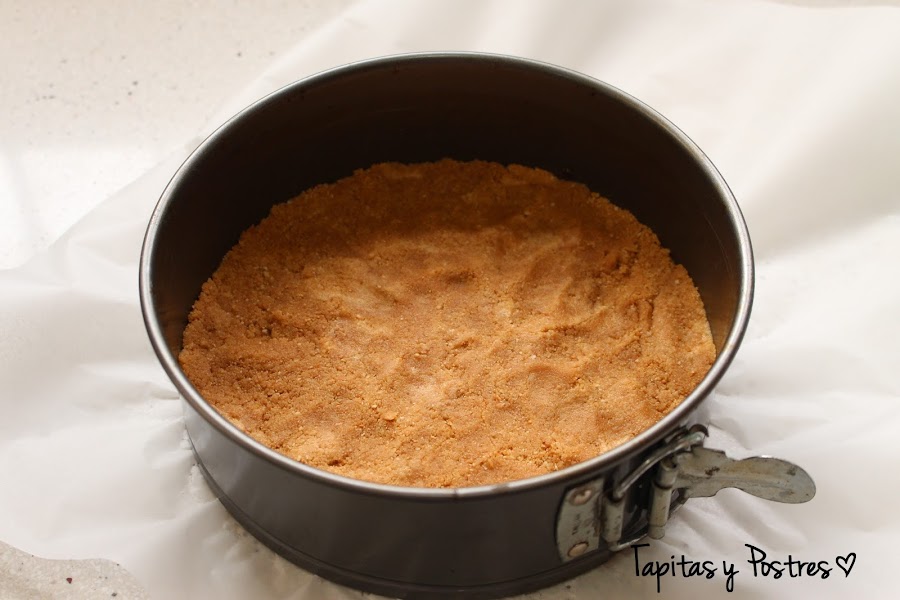 Mezclamos con la mantequilla y ponemos en el fondo de un molde. A la nevera.