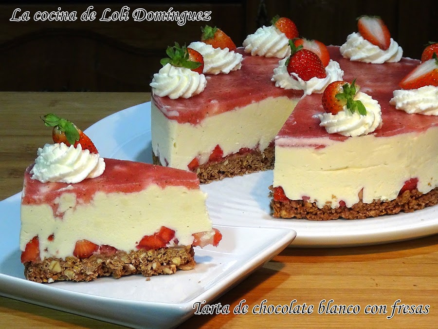 Tarta de chocolate blanco con fresas y sin horno. Esta tarta es la favorita de mi hijo David ya que el chocolate blanco es su preferido y si le añadimos las fresas ¡¡ufff!!. Además lleva una base extracrujiente de avellanas, maíz tostado y chocolate. El contraste de su acidez y la dulzura del chocolate blanco es una auténtica delicia, seguro que será vuestra favorita también.