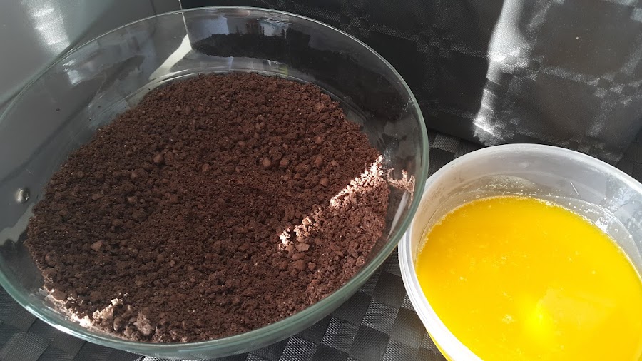 Mezclamos muy bien las galletas con la mantequilla y forramos el molde donde vayamos a preparar la tarta con esa mezcla. Dejamos en la nevera mientras preparamos el resto.