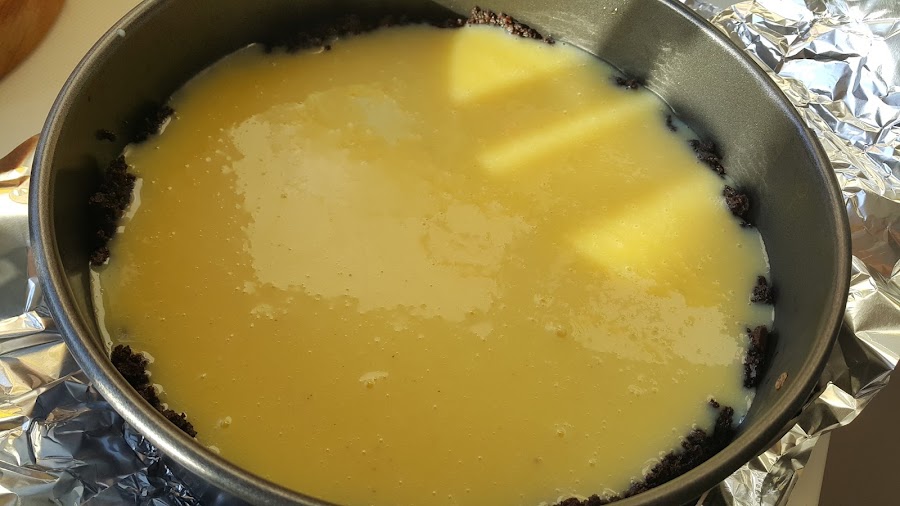 Una vez atemperada añadimos la mezcla al molde donde hemos preparado la base.