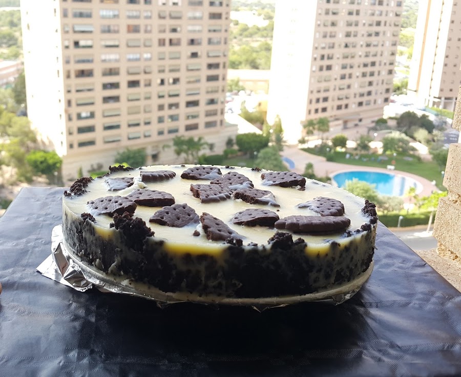 Separamos la crema de las galletas y reservamos. Trituramos las galletas y derretimos 180gr mantequilla para poder hacer la base de la tarta.