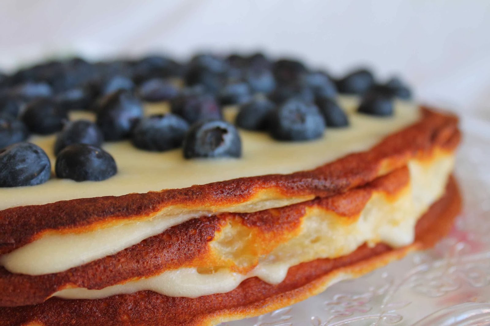 Dicho lo cual os cuento como es esta tarta formada por 3 bizcochos muy finos,son bizcochos elaborados sin harina, intercaladas con un lemon curd muy ligero y adornada por arándanos. El lemon curd hasta ahora lo preparaba con la Thermomix pero en esta ocasión la he preparado al baño maría, el punto crítico es controlar la temperatura de la crema sin termómetro, pero os daré algunos detalles que espero os ayuden.