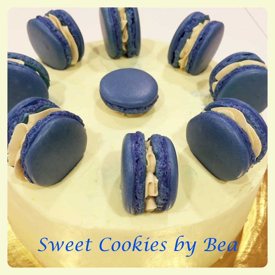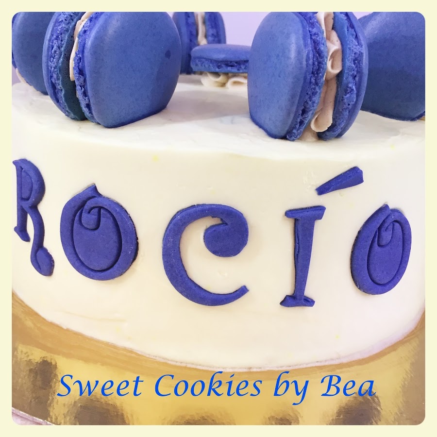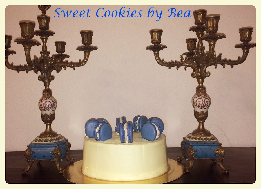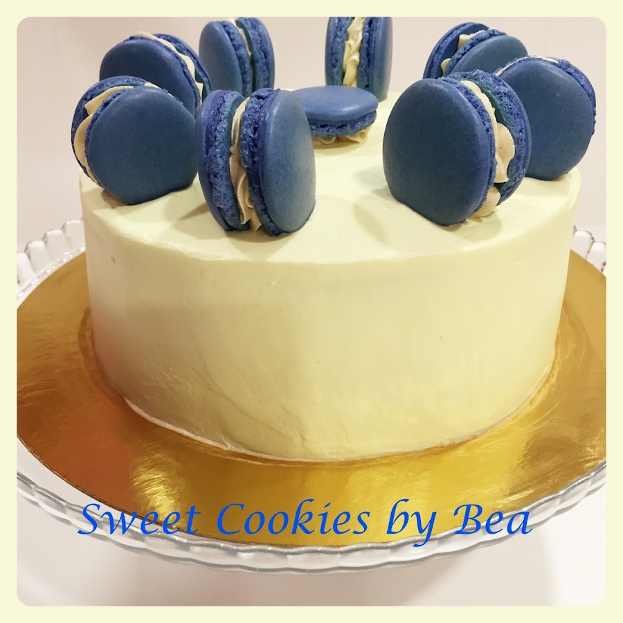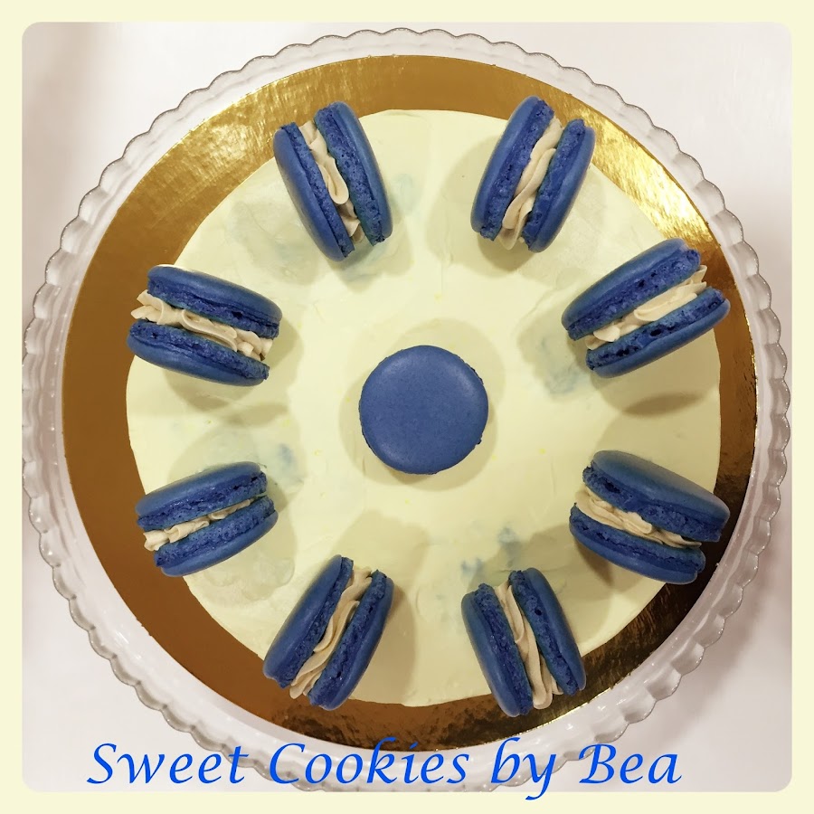 Una peque que su color favorito es el azul y que mejor poner el toque de color a una tarta con la crema de chocolate blanco que coronarla con unos macarons con un tono azul muy bonito