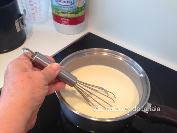añadiremos la leche con la cuajada, recordando que es importantisimo no dejar de remover porque se pega con una facilidad pasmosa. Lo llevaremos a ebullición y retiramos del fuego.