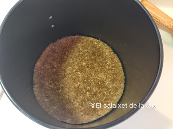 Engrasamos el molde, y ponemos la masa en el fondo aplanándola lo mas posible, y dejamos el molde en el congelador unos minutos para que se endurezca y quede crujiente