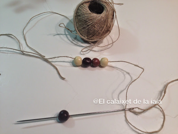 Podemos decorar según la inspiración del momento, a mi se me ha ocurrido hacer una guirnalda con éstos elementos que tenía en casa. Enhebramos una aguja lanera o saquera y con hilo vamos pasando la aguja por el centro de cada bolita con mucho mimo para que no se rompan (si se nos rompe alguna, premio para la cocinera jeje)