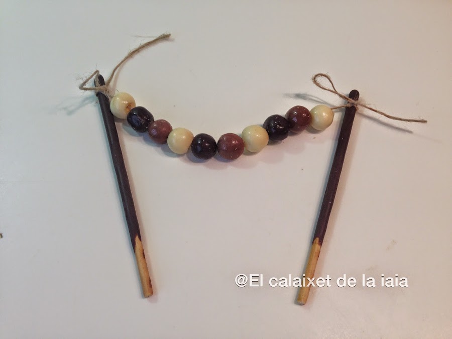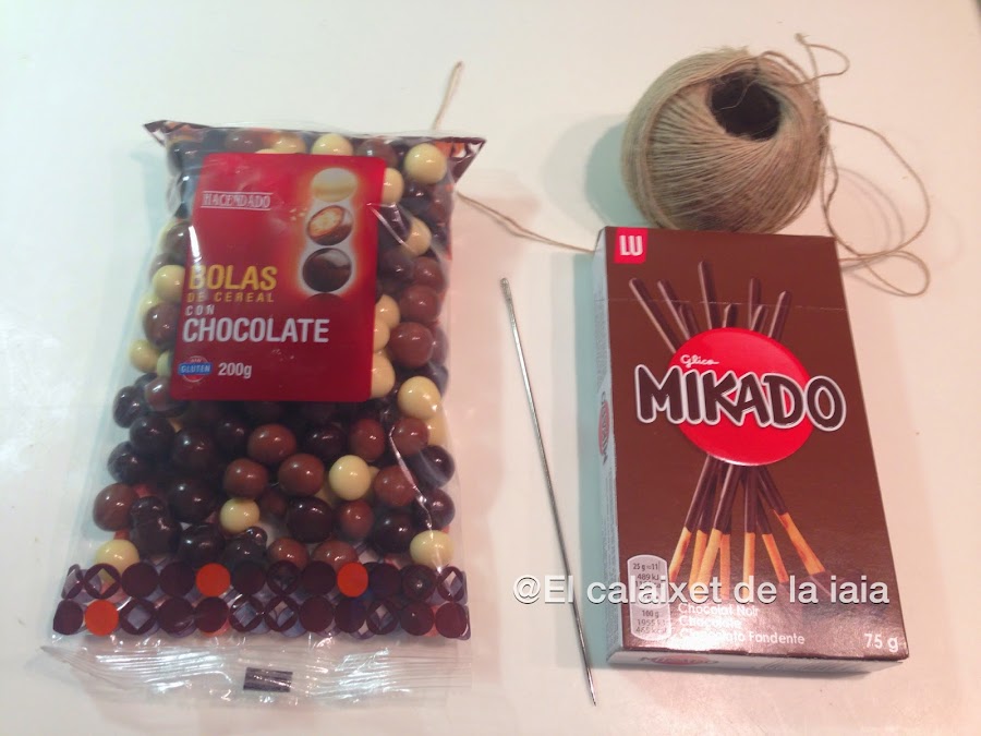 podemos utilizar como palos unos de madera de brocheta, como tenía una cajita de Mikado, he cortado el hilo y he atado los extremos a los palitos, así será todo comestible, menos la cuerda claro...