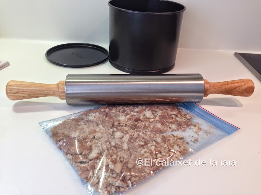 Comenzaremos picando las galletas, a mi me gusta hecerlo metiéndolas en una bolsa de congelación y aplanándolas con el rodillo amasador