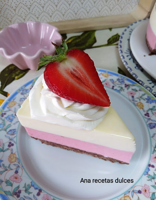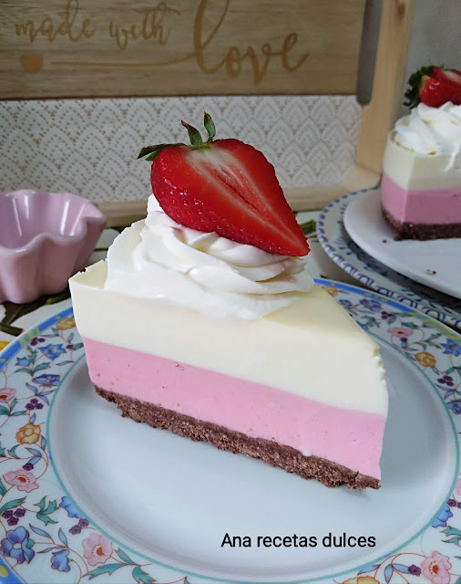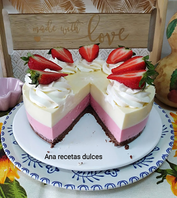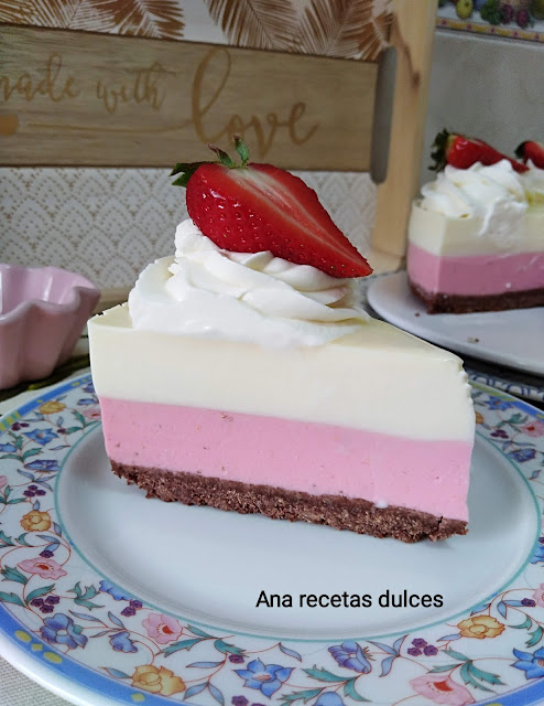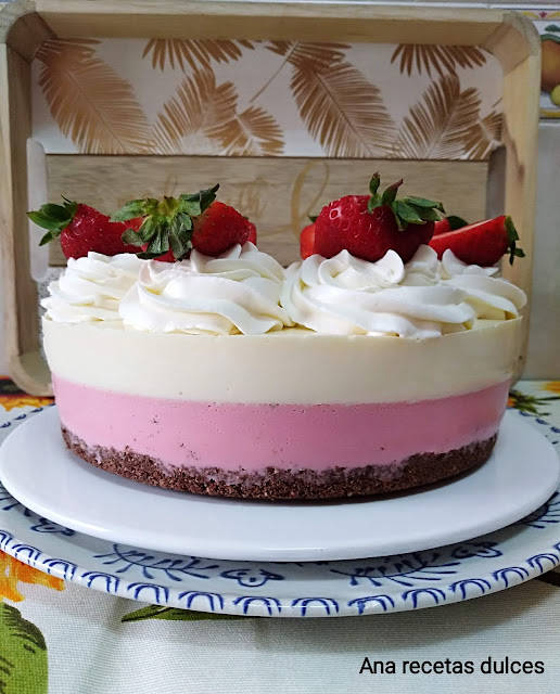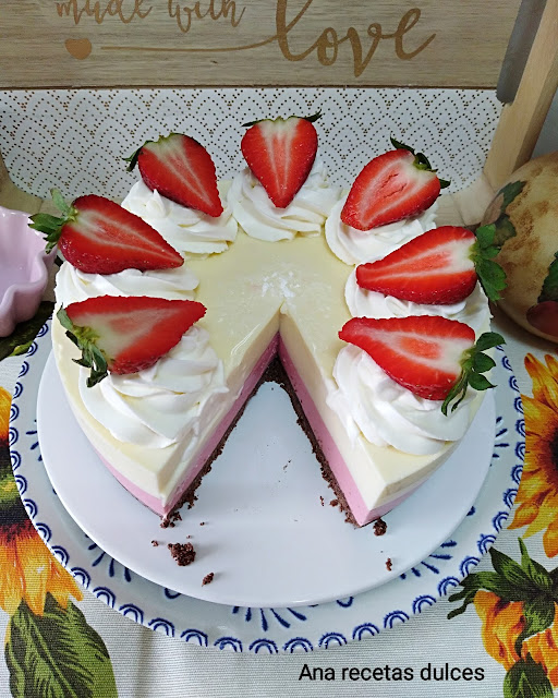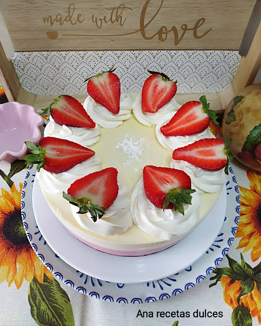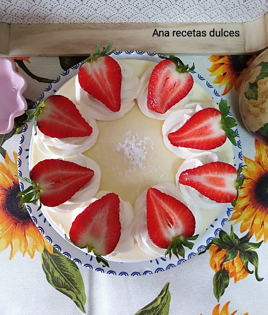 Al día siguiente desmoldamos y decoramos la tarta, le hacemos unos copetitos con la nata montada (crema de leche) y en cada copetito le ponemos media fresa y ya la tenemos lista para disfrutarla.