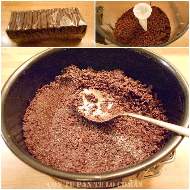 La base de galletas la he visto hacer con oreos y con chips ahoy, pero yo la he hecho con galletas fibra línea de cacao que eran las que tenía en casa y además me gustaba el color que le iban a dar a la base. Además le he añadido la mantequilla de siempre y sirope de chocolate, y ha sido todo un acierto porque así las dos partes saben a chocolate de verdad.