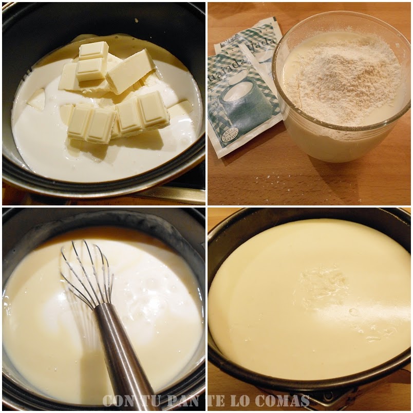 La parte de chocolate blanco lleva cuajada, y ya sé que al otro lado del charco no se conoce ni se encuentra, pero supongo que con gelatina se puede hacer igualmente.