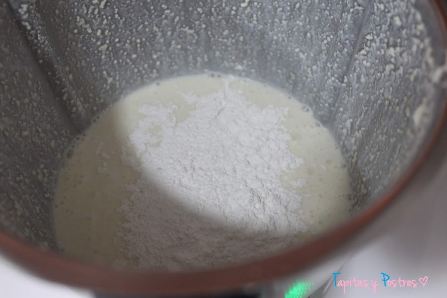 Vamos con el relleno. Trituramos el chocolate blanco 10 segundos a velocidad 10. Agregamos al vaso de la thermomix el queso y la leche. mezclamos 15 segundos a velocidad 3. Añadimos los sobres de cuajada y programamos 7 minutos, 90º y velocidad 4.