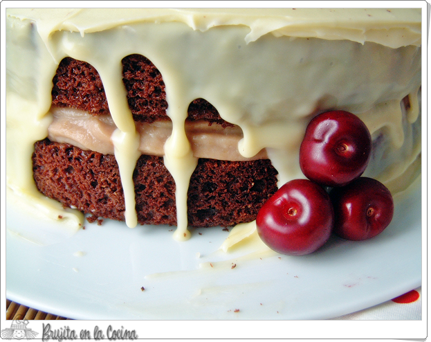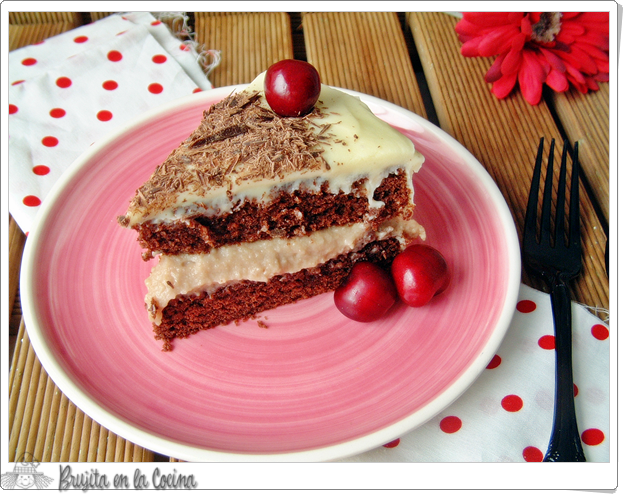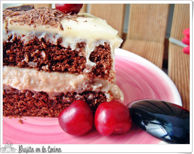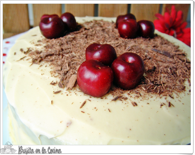 Para el montaje cogemos un bizcocho cubrimos con la crema de cerezas y tapamos con el otro bizcocho. Después vertemos el chocolate ya frío por encima dejando que escurra por los laterales.