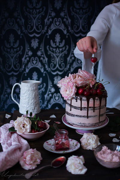 Para el relleno me decidí por una simple pero riquísima nata montada (crema de leche) y mermelada de cerezas, para cubrirla usé un SMBC pues quería que tuviera cuerpo para poder “chorrearle” o “dripear” el ganache de chocolate, no me fiaba que la nata (crema de leche) se viniera abajo.