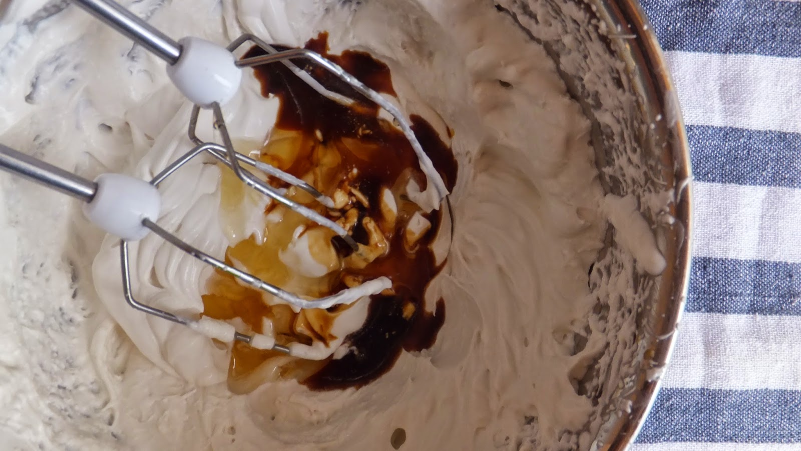 13. Añade el endulzante y la esencia de vainilla y continua mezclando hasta que adquiera la consistencia parecida a la de la nata montada (crema de leche) (no quedará tan firme como la nata (crema de leche) ni creara picos tan pronunciados).