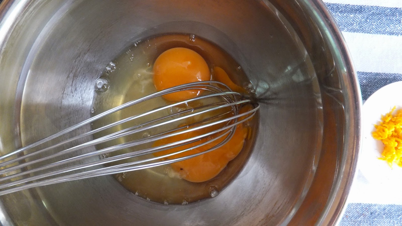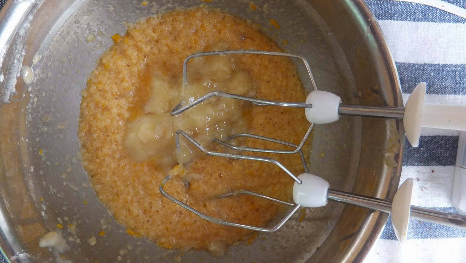 6. Mezcla los ingredientes húmedos: bate los huevos y añade el aceite de coco, la vainilla, la ralladura de naranja, el platano machacado y remueve bien.