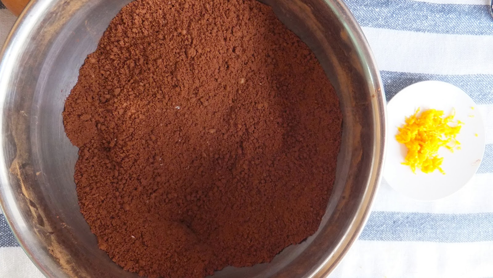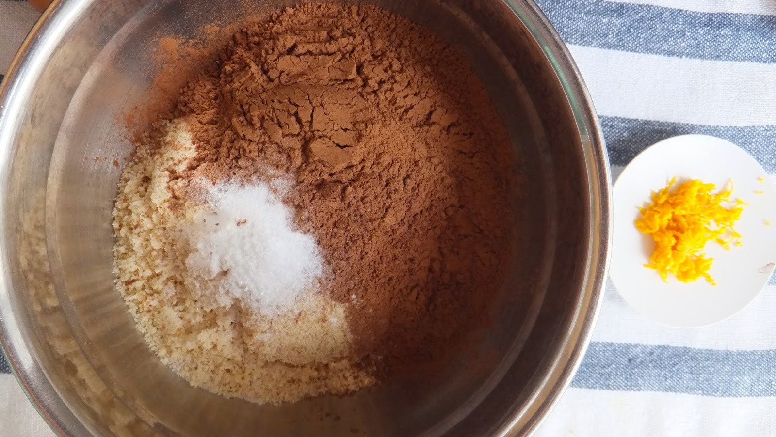 3. Mezcla los ingredientes secos: almendra molida, sal, bicarbonato y el cacao.