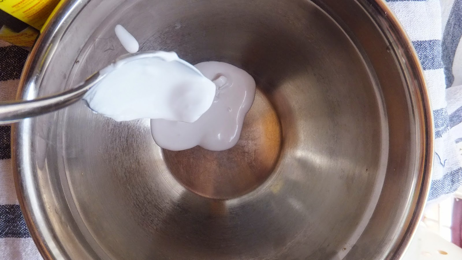 11. Prepara la crema batida de coco. Con una cucharada recoge solo la crema de coco que ha quedado en la superficie procurando no añadir nada de agua que estará más al fondo. Ve echando la crema a otro bol. (El agua sobrante se puede utilizar, p.j, para hacer batidos de fruta)