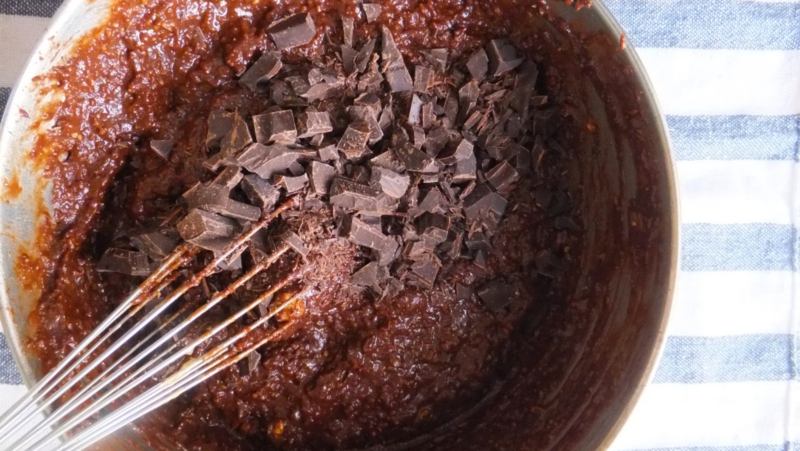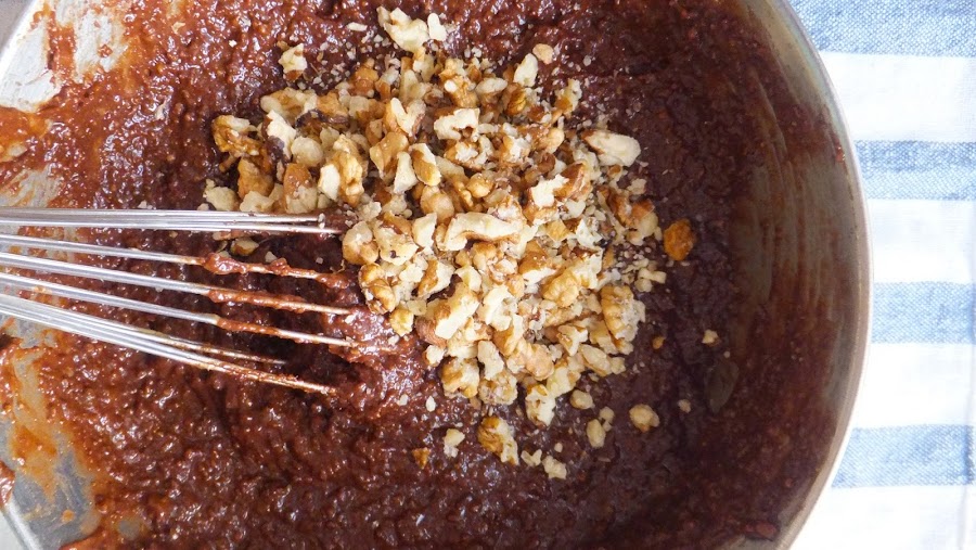 8. Vierte la mezcla de ingredientes líquidos a las de los solidos y mezcla hasta queden bien integrados. Después añade las nueces y el chocolate en trozos y remueve hasta distribuirlos bien.