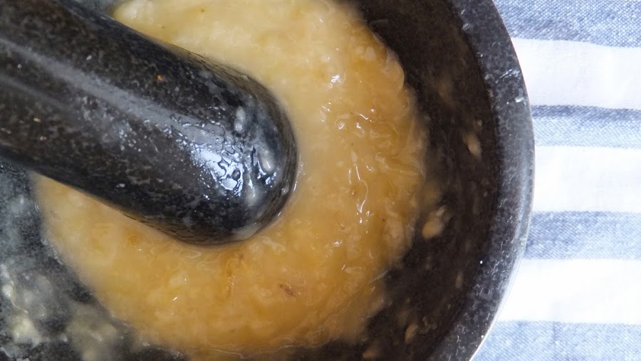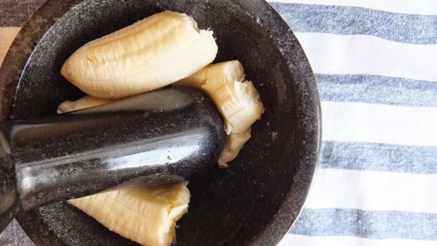 4. Aplasta el platano en un mortero o con un tenedor hasta hacerlo puré.