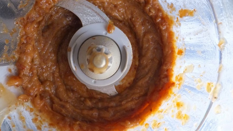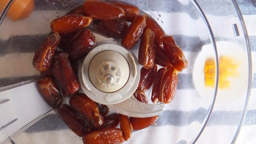 5. En un procesador de alimentos tritura los dátiles con el agua hasta conseguir un crema pegajosa lo más homogénea posible.