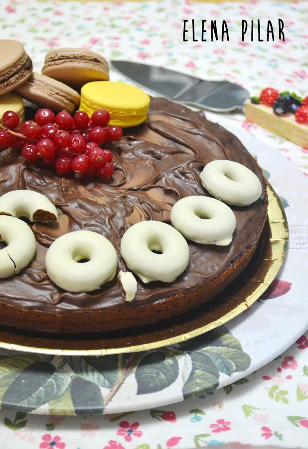 En cuanto a la decoración, yo utilicé unos macarons (ya que he aprendido ha hacerlos bien, tengo que aprovecharlos y exhibirlos cual trofeo -¡¡hacen que me sienta una repostera de verdad!!-) y, como la norma para participar era que la tarta tenía que estar decorada, de manera original, con la cifra de "250.000", utilicé unos Filipinos blancos para "dibujar" esos números.