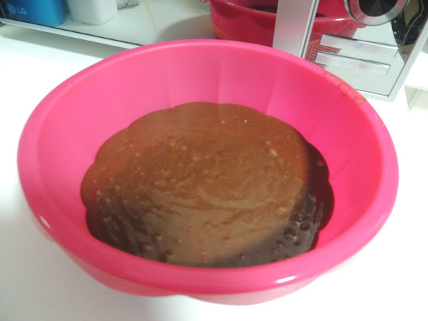 Ponemos la masa en un recipiente apto para horno. Yo usé uno de silicona, pero si usáis uno metálico o de cristal recordad que es muy importante untarlo con mantequilla y harina para poder desmoldar la tarta después.