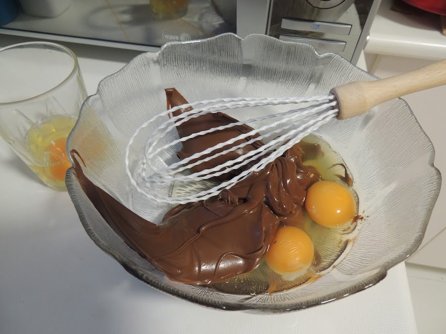 Ponemos la crema de cacao en un bol y acto seguido vamos incorporando los huevos. Es muy importante cascarlos en un recipiente aparte para que en caso de que uno salga malo o nos caiga cascara no se nos pueda estropear el resto de la tarta.