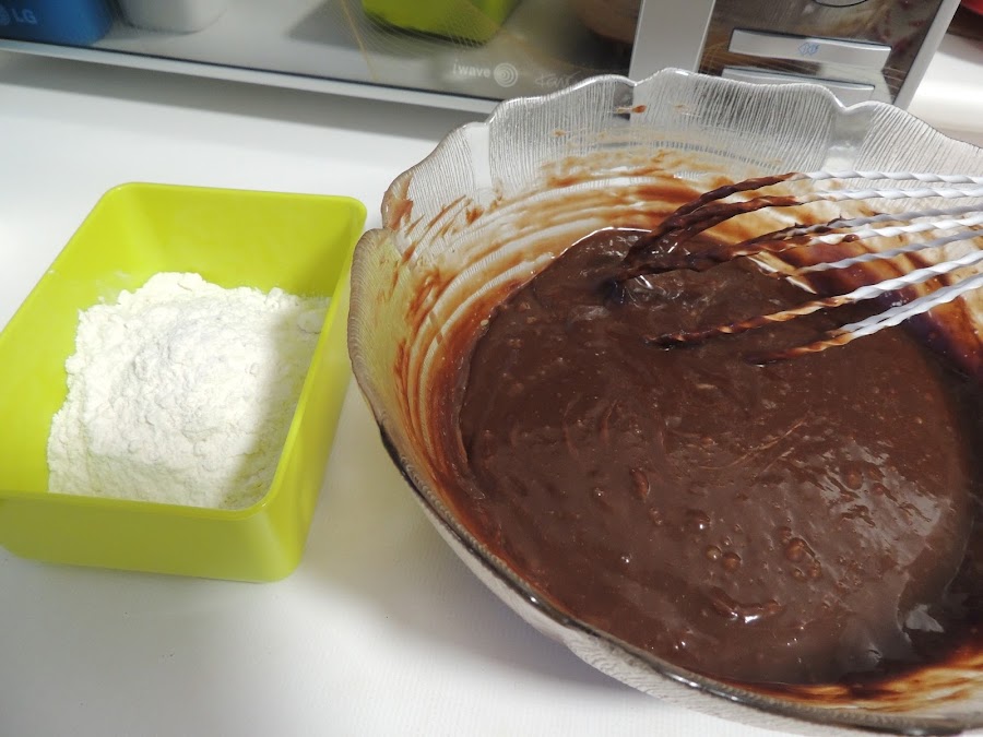 Mezclamos muy bien la crema de cacao con los huevos y juntamos la harina con la levadura en recipientes separados, tal y como se ve en la foto.