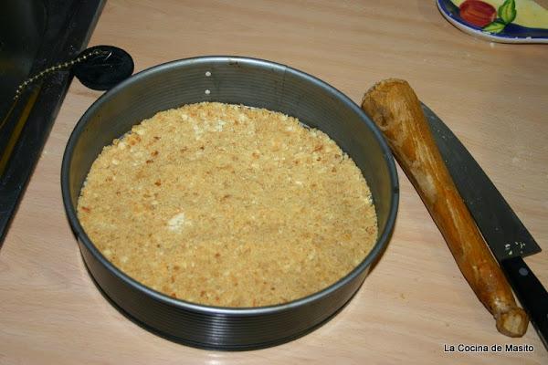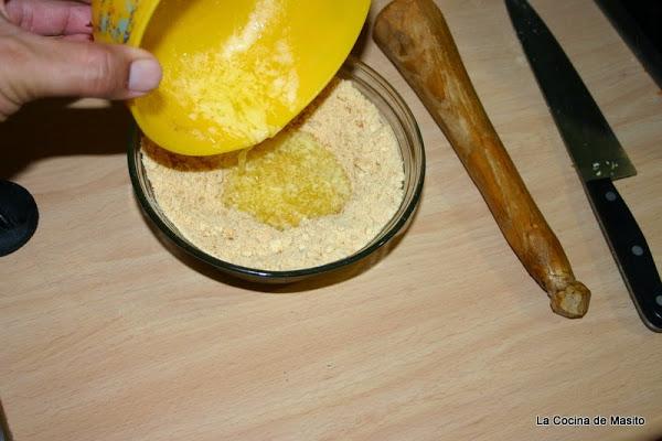 Procedemos calentando la mantequilla en el micro y mezclandola con las galletas hasta crear una masa