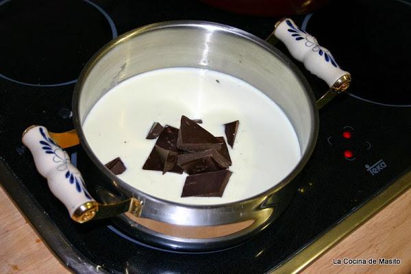 En una olla ponemos a calentar la nata (crema de leche) y los trozos de chocolate