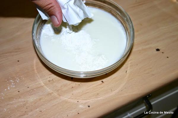 Mientras que vaya cogiendo temperatura en la leche vertemos los sobres de cuajada y lo removemos bien