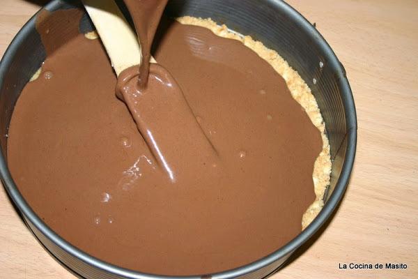 Con la mezcla tibia, es decir, templada, la incorporaremos a la base de galletas que teníamos en la nevera, la echaremos con cuidado ayudándonos de una pala de madera para no hacer agujero en la galleta. lo llevamos la nevera y dejamos que enfrie unas tres horas, hasta que el chocolate este casi cuajado.