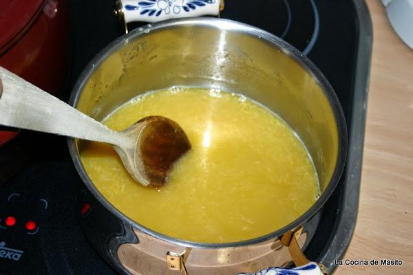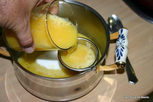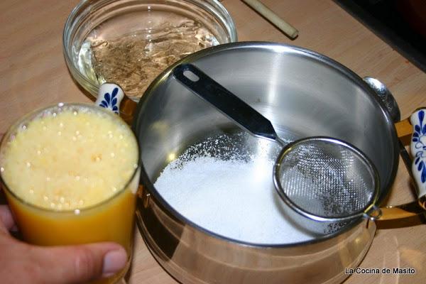 Echamos en una cazuelilla el azucar y el zumo colado si no os gusta la pulpa, si os gusta ni lo coleis y lo ponemos a calentar