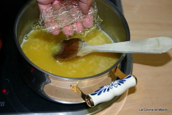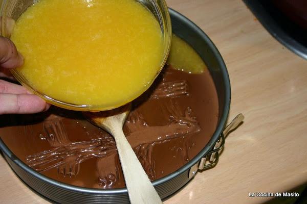 Igual que en el paso del vertido anterior, nos ayudamos de una cuchara de madera y echamos la naranja sobre el chocolate