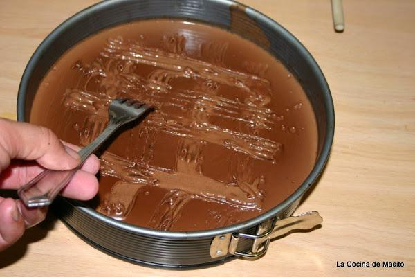 Sacamos el chocolate de la nevera y con un tenedor le hacemos unas marcas par que agarre bien la gelatina y no se separe una vez que cuaje